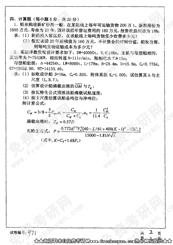 华中科技大学2002年考研真题-船舶设计原理