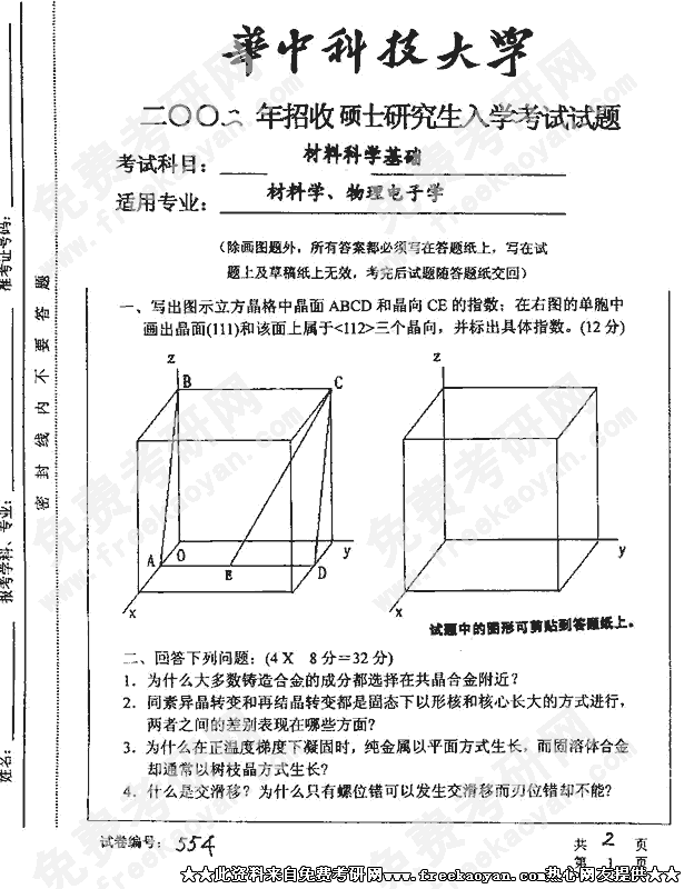华中科技大学2002年考研真题-材料物理