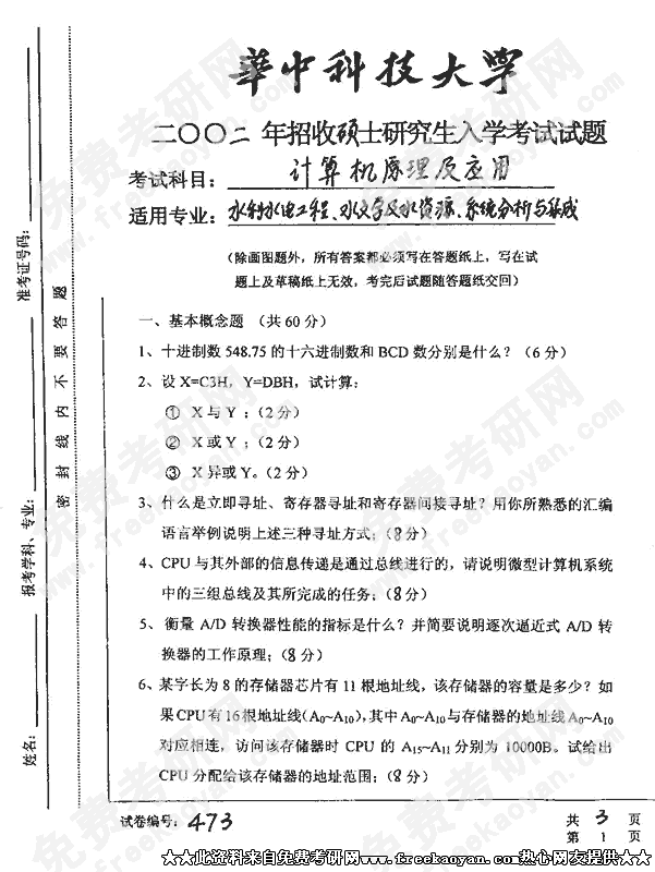 华中科技大学2002年考研真题-不可压缩流体力学基础