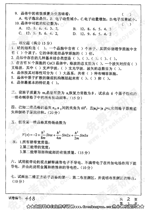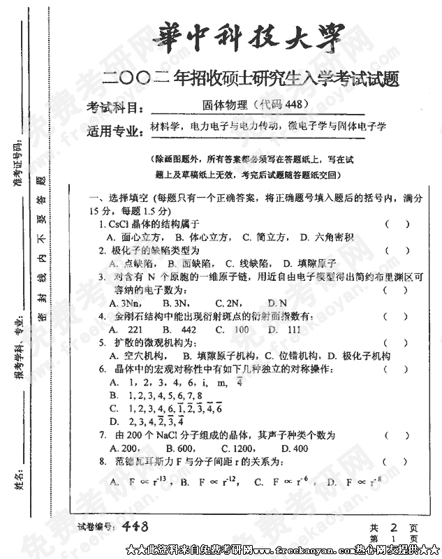 华中科技大学2002年考研真题-固体物理