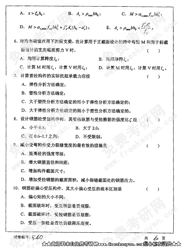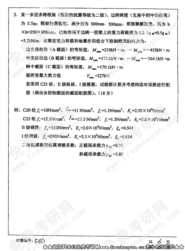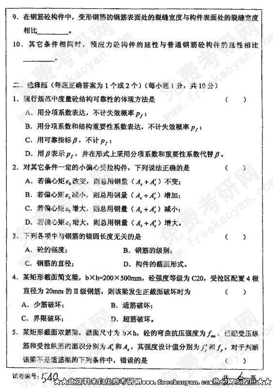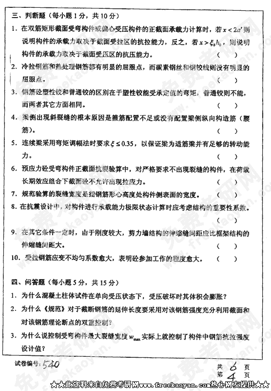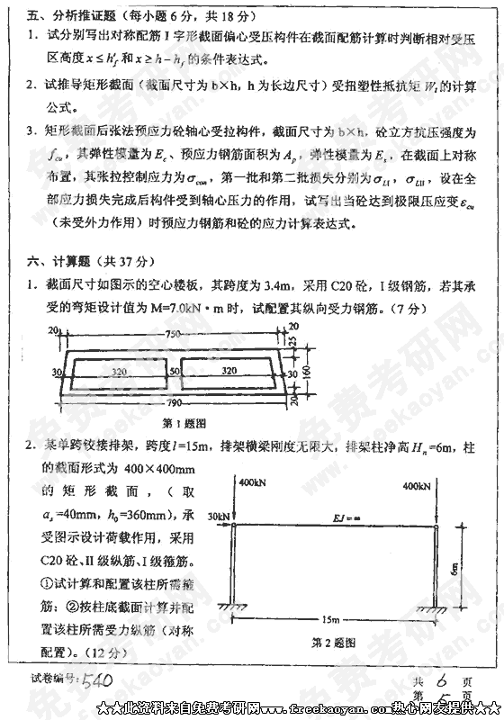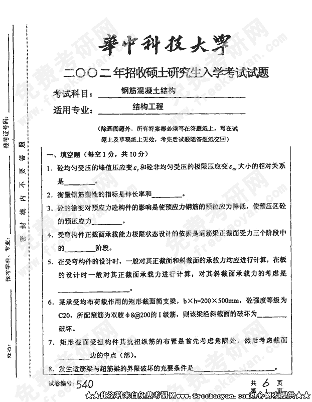 华中科技大学2002年考研真题-钢筋混凝土结构