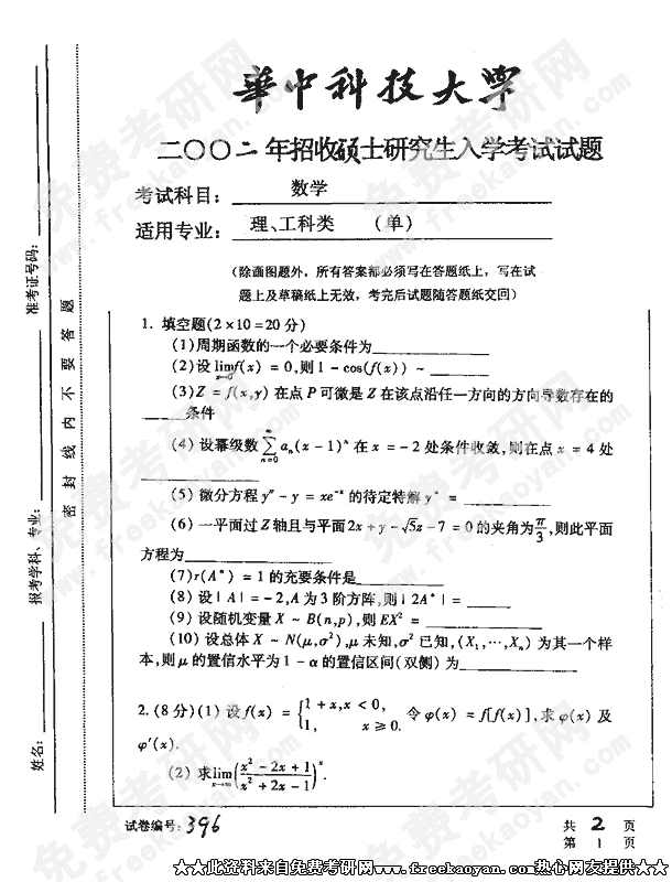 华中科技大学2002年考研真题-高级语言程序设计(C语言)