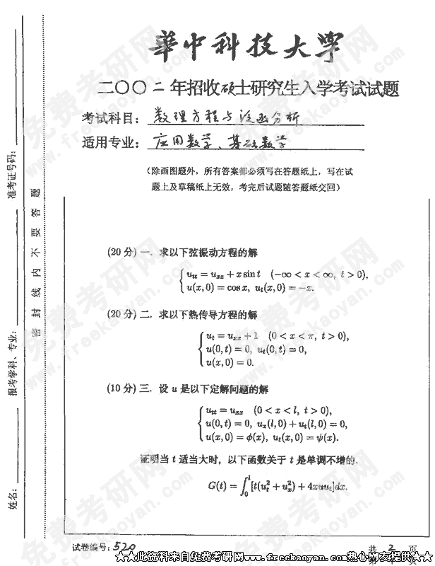 华中科技大学2002年考研真题-数理方程与泛函分析