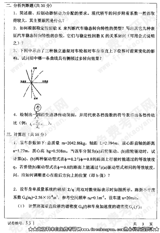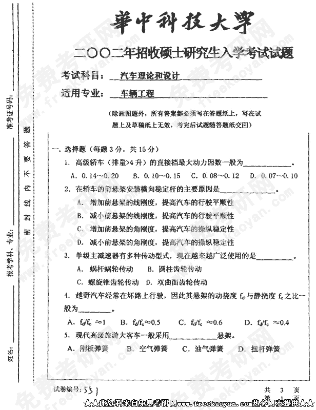 华中科技大学2002年考研真题-汽车理论和设计