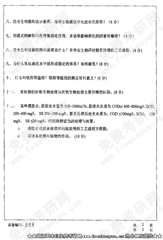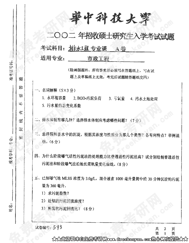 华中科技大学2002年考研真题-排水工程专业课A卷