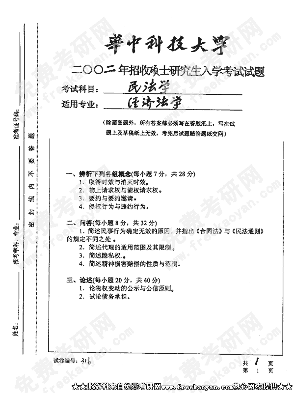 华中科技大学2002年考研真题-民法学