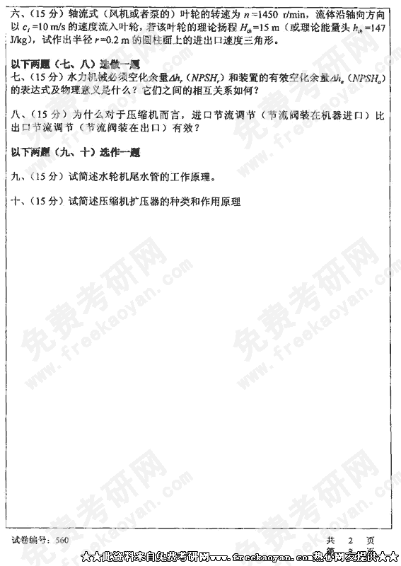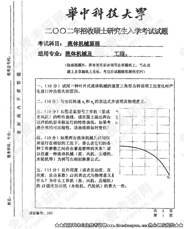 华中科技大学2002年考研真题-流体机械原理