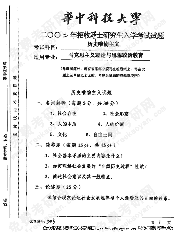 专业课考研经验 本站小编 FreeKaoyan 2018-01-22华中科技大学2002年考研真题-马克思主义哲学史