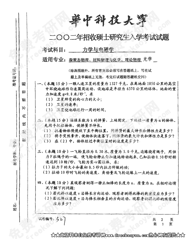 华中科技大学2002年考研真题-排水工程专业课A卷