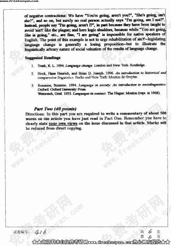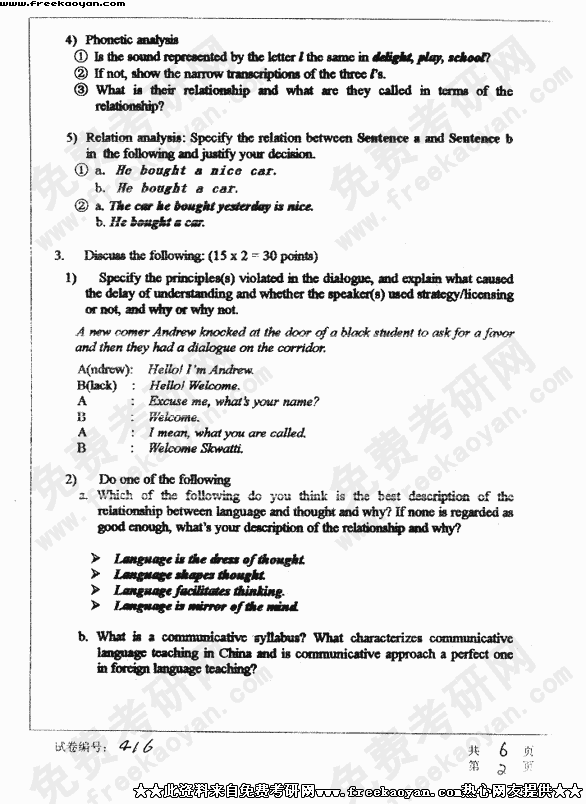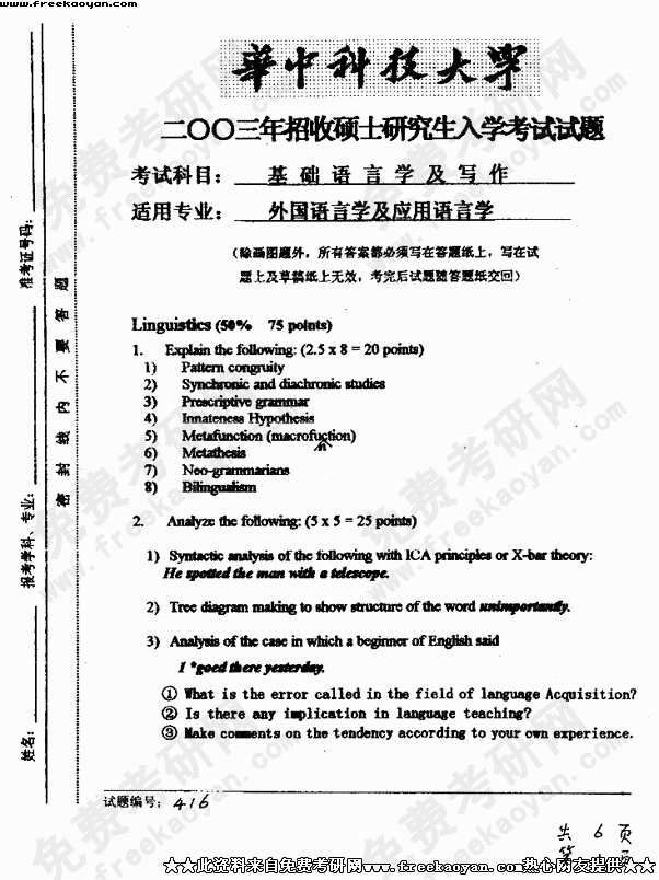 华中科技大学2003年考研真题-基础语言学及写作