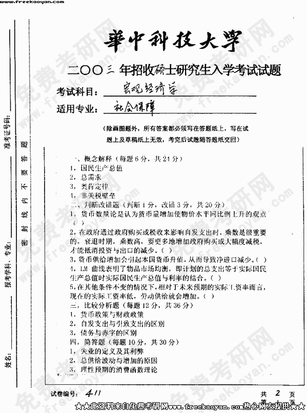 华中科技大学2003年考研真题-宏观经济学