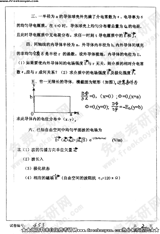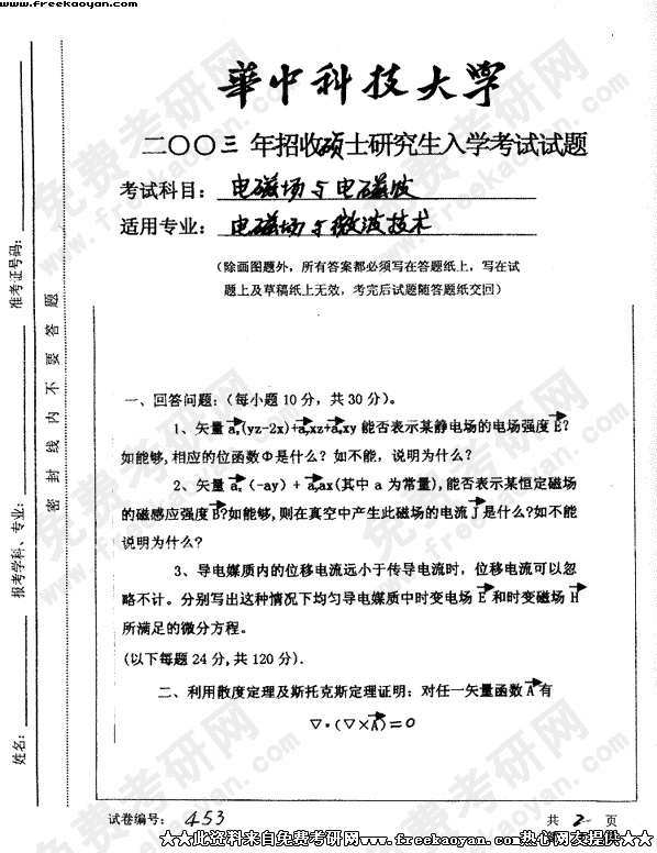 华中科技大学2003年考研真题-电磁场与电磁波