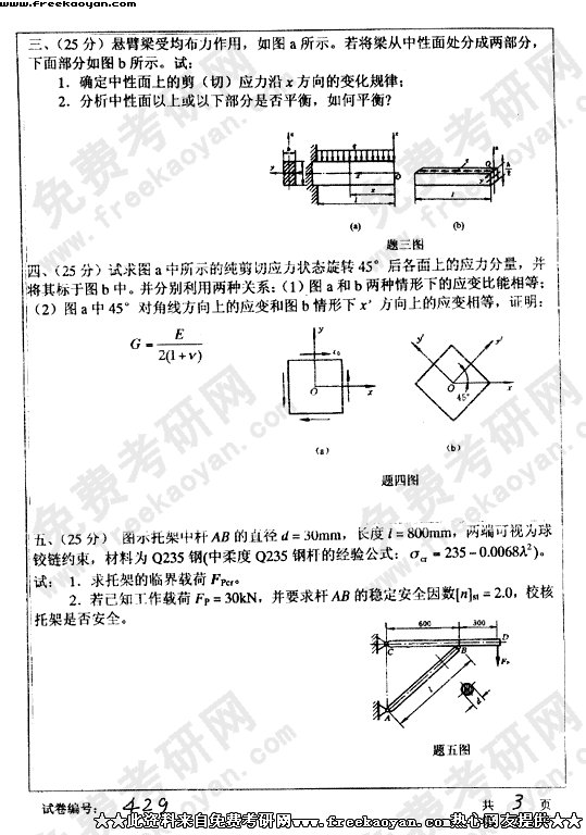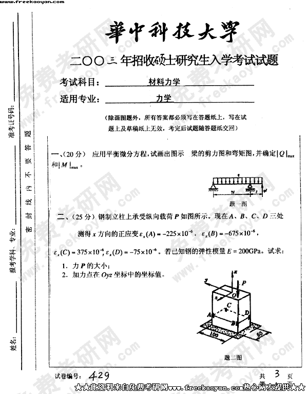 华中科技大学2003年考研真题-材料力学(岩土工程、道路与铁路工程)