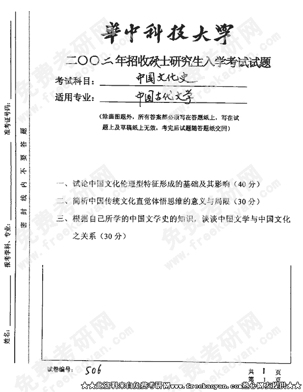 专业课考研经验 本站小编 FreeKaoyan 2018-01-22华中科技大学2002年考研真题-中国文学史