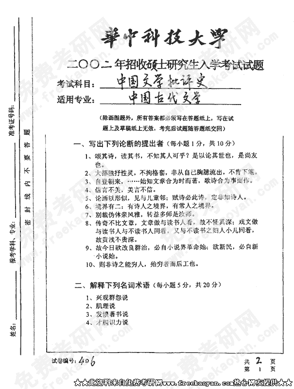 华中科技大学2002年考研真题-中国史文学批评
