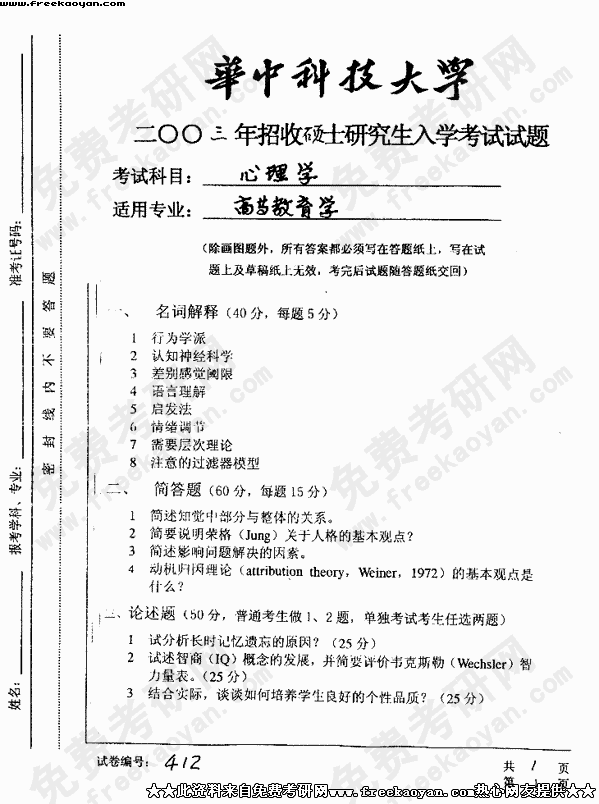 相关话题/华中科技大学 考研真题 心理学