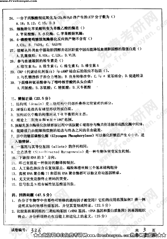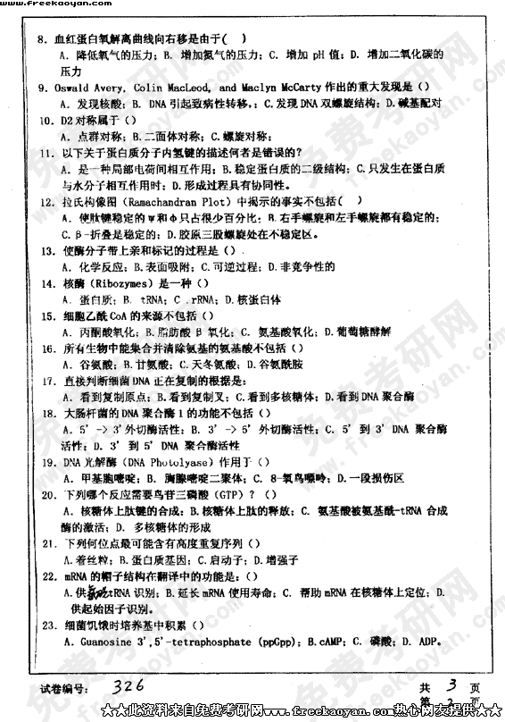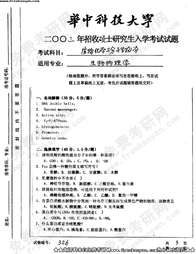 华中科技大学2003年考研真题-生物化学与分子生物学