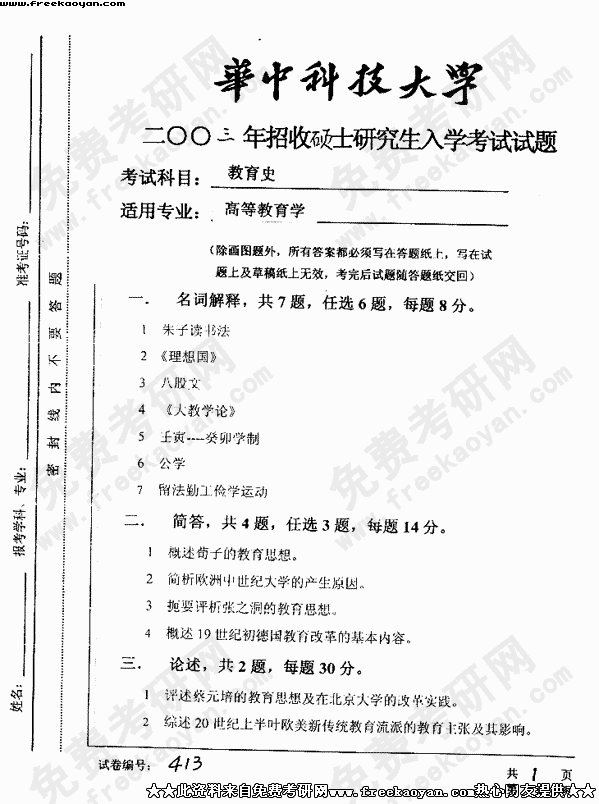 专业课考研经验 本站小编 FreeKaoyan 2018-01-22华中科技大学2003年考研真题-科学技术史