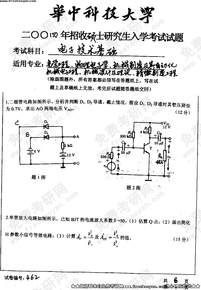 华中科技大学2004年考研真题-电子技术基础试题A