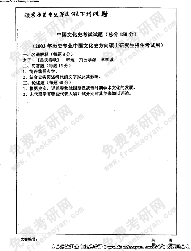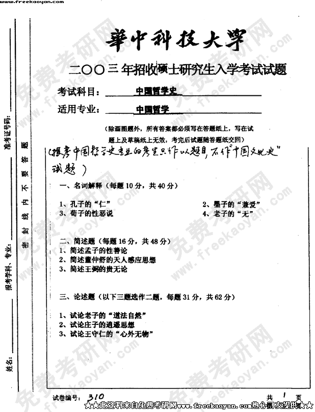 华中科技大学2003年考研真题-综合考试(计算机学院各专业,机械学院各专业,模式识别与智能系统)