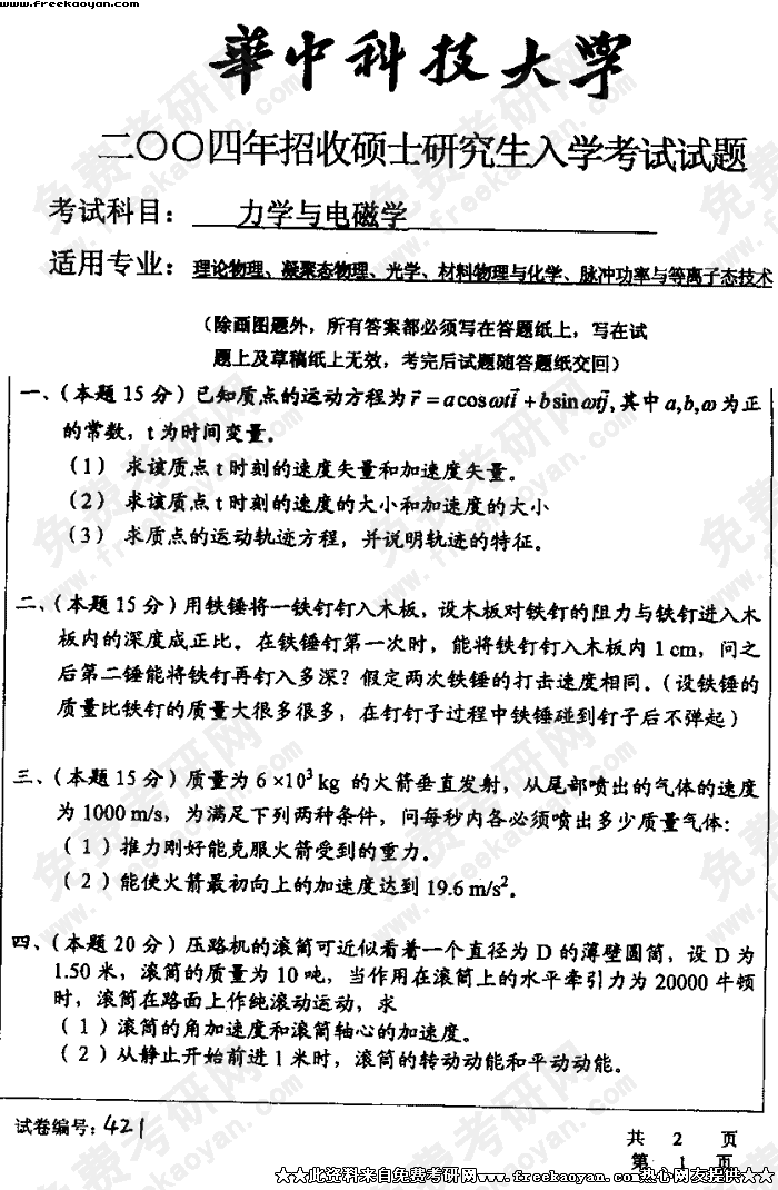 华中科技大学2003年考研真题-专业基础综合课(光学工程、物理电子学)