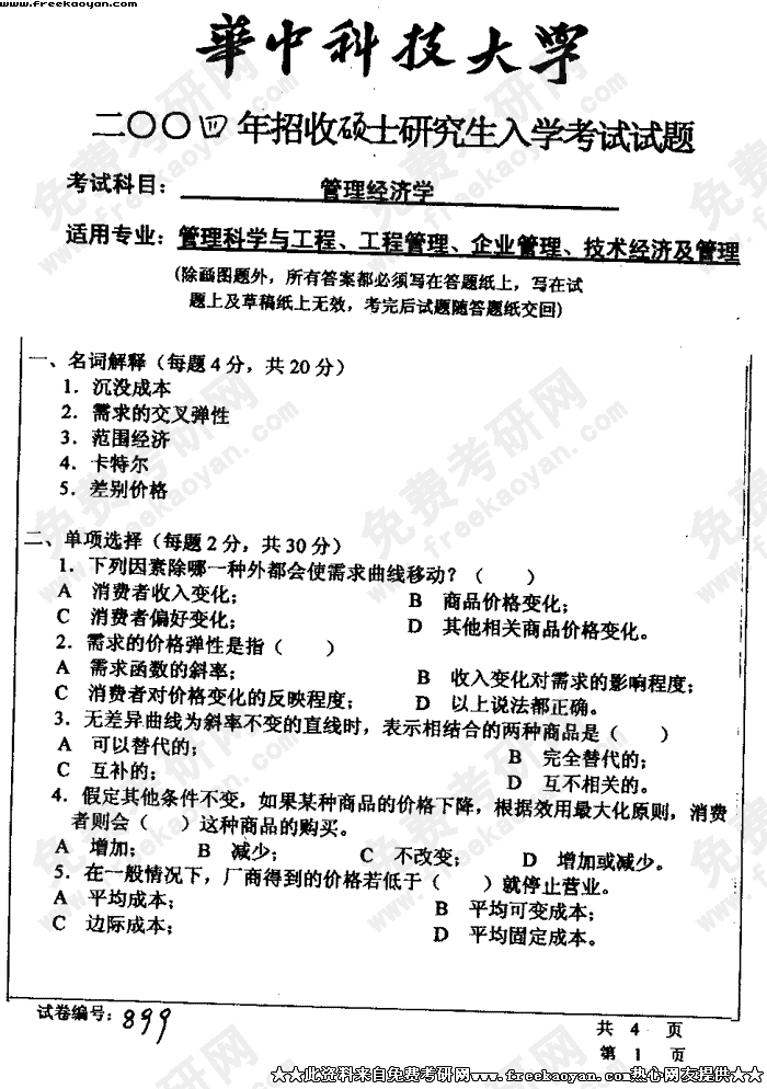 华中科技大学2004年考研真题-工商管理硕士管理试题