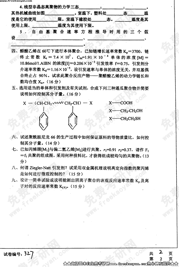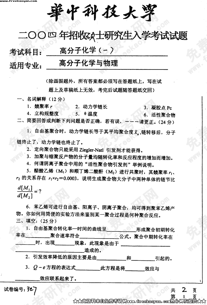 华中科技大学2004年考研真题-高分子化学(一)试题