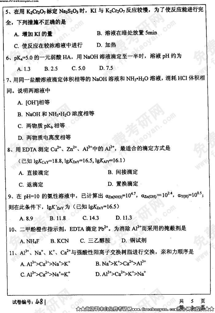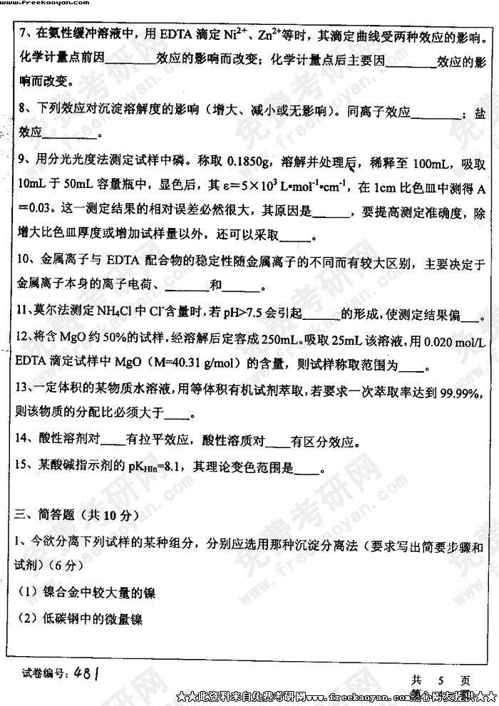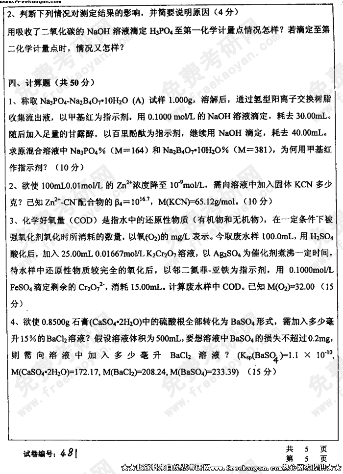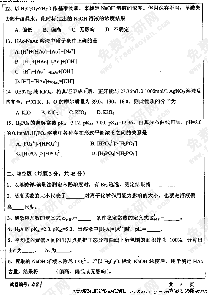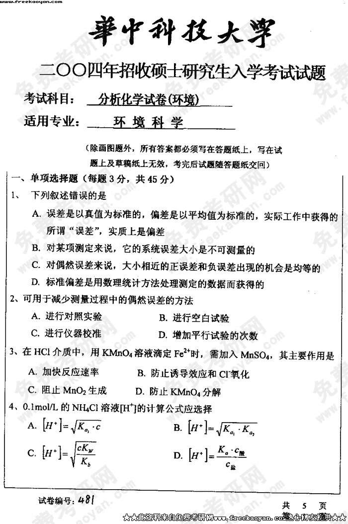 华中科技大学2004年考研真题-分析化学试卷(环境)