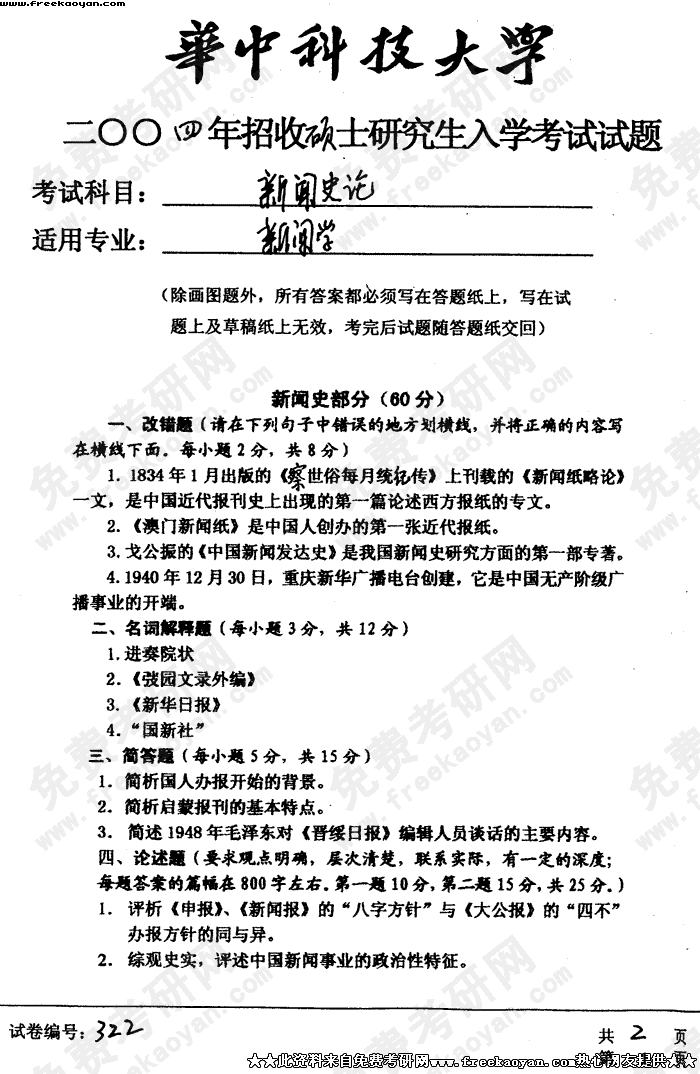 华中科技大学2004年考研真题-新闻业务(一)试题