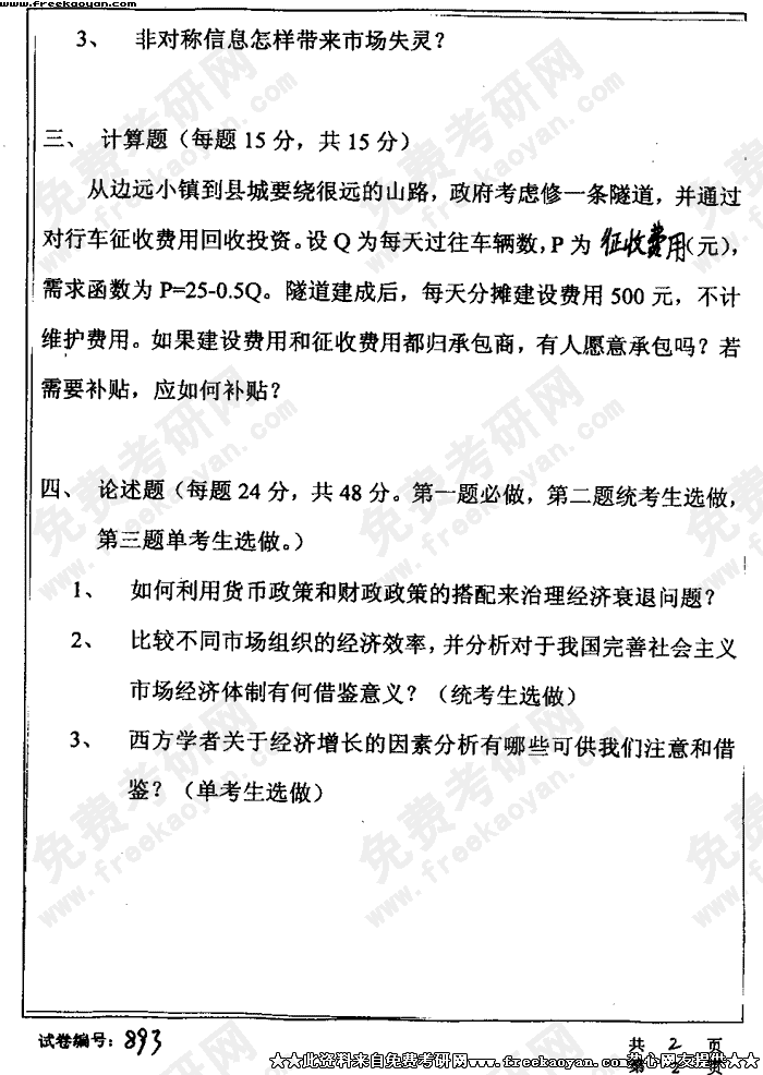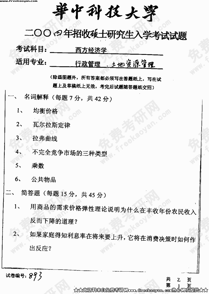 华中科技大学2004年考研真题-西方经济学