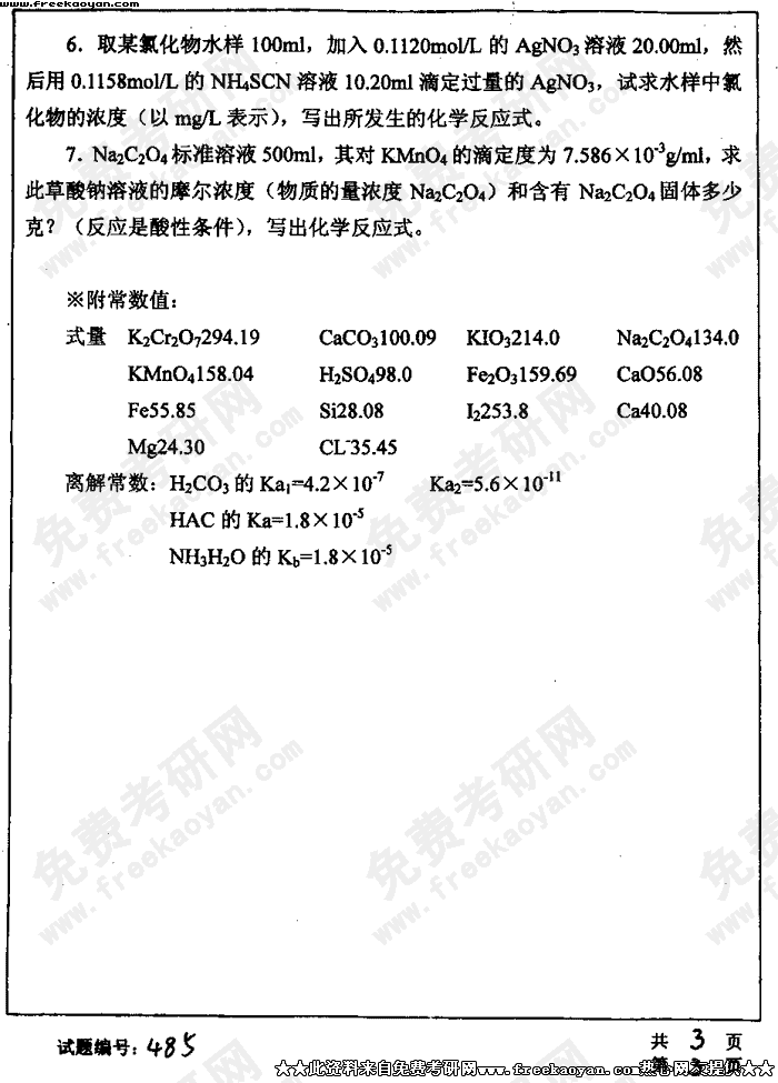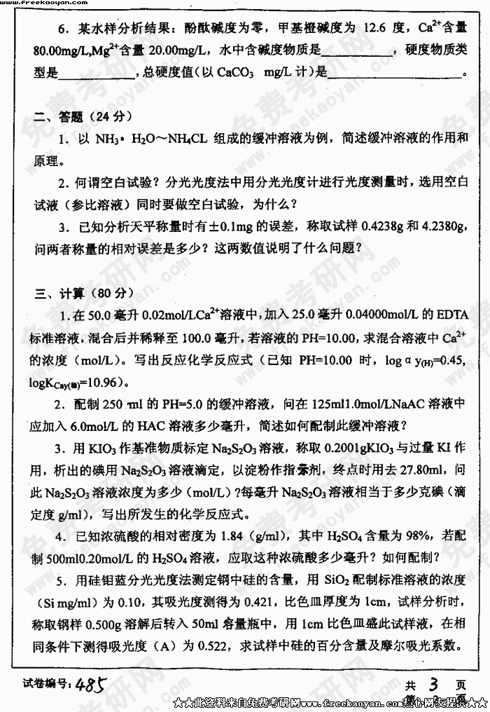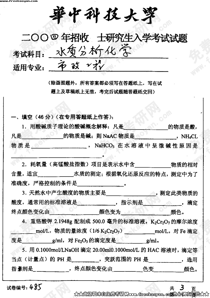 华中科技大学2004年考研真题-水质分析化学