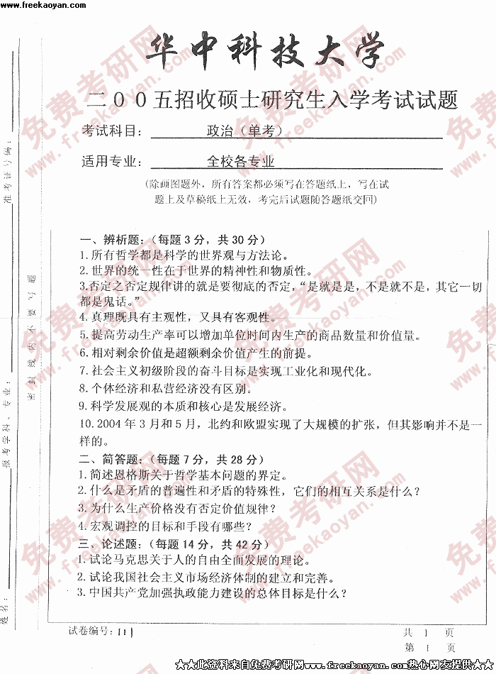 华中科技大学2005年考研真题-政治(单考)