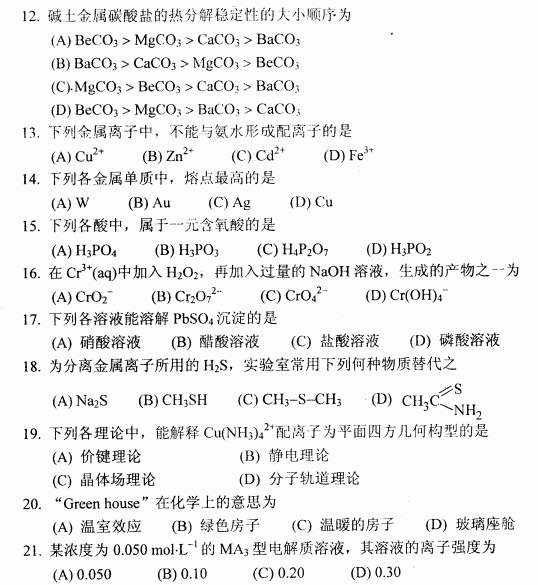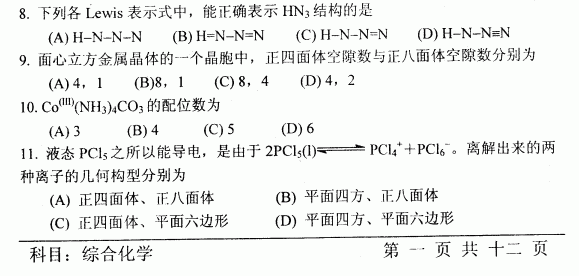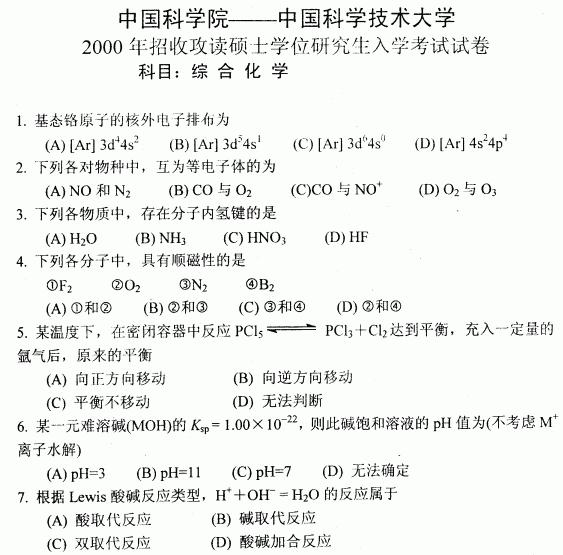 中国科学技术大学2000年考研真题-综合化学第一部分