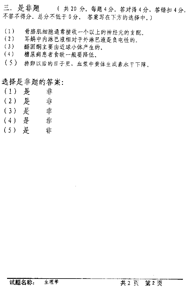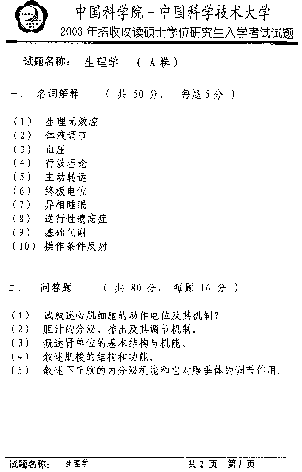 中国科学技术大学2003年考研真题-生理学(A卷)