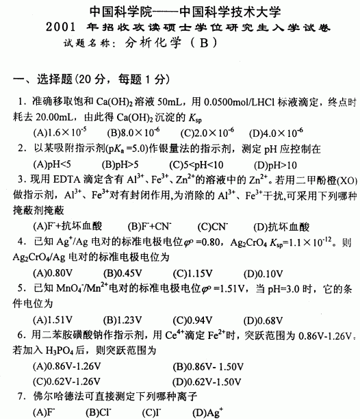 中国科学技术大学2001年考研真题-分析化学B
