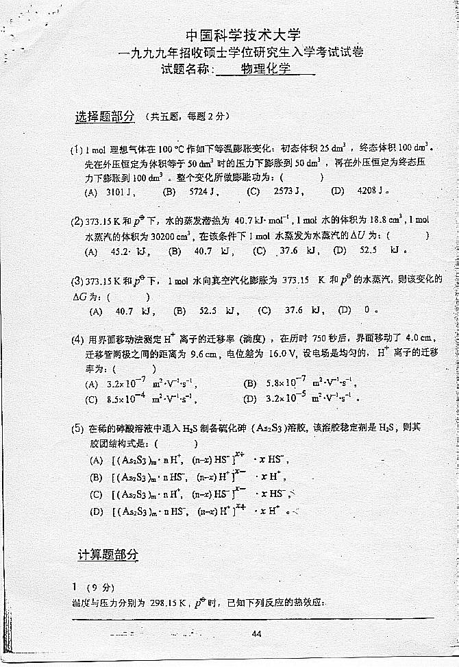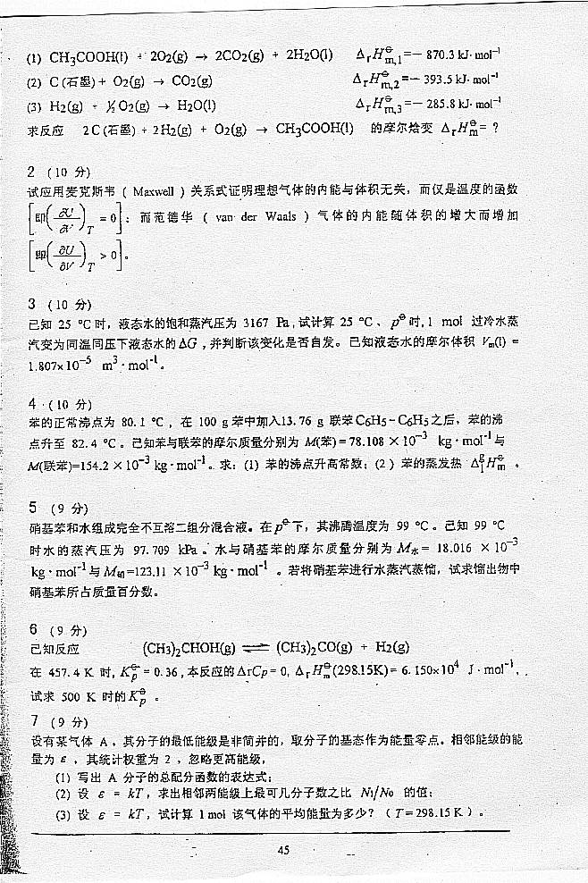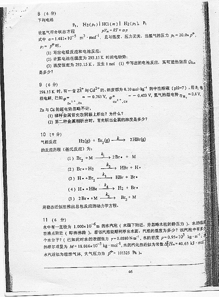 专业课考研经验 本站小编 FreeKaoyan 2018-01-22中国科学技术大学1998年考研真题-物理化学