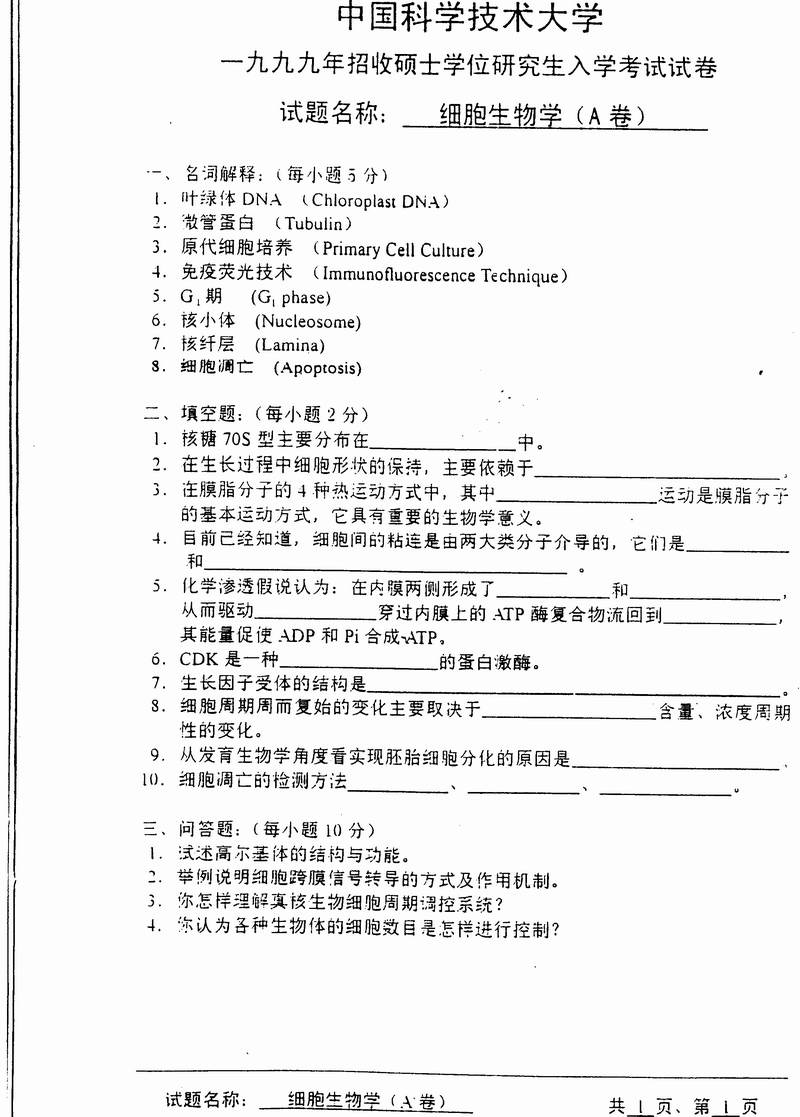 中国科学技术大学1999年考研真题-细胞生物学A