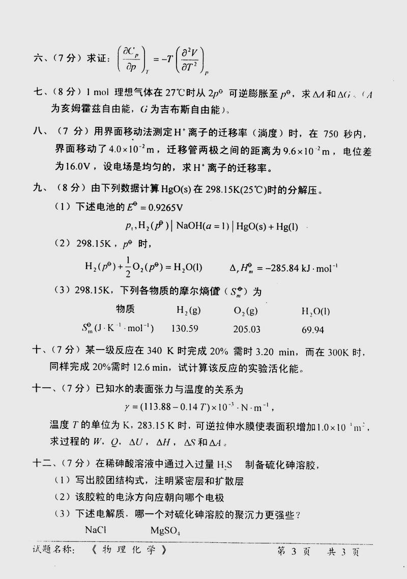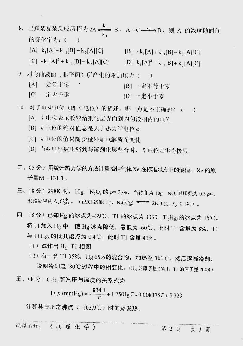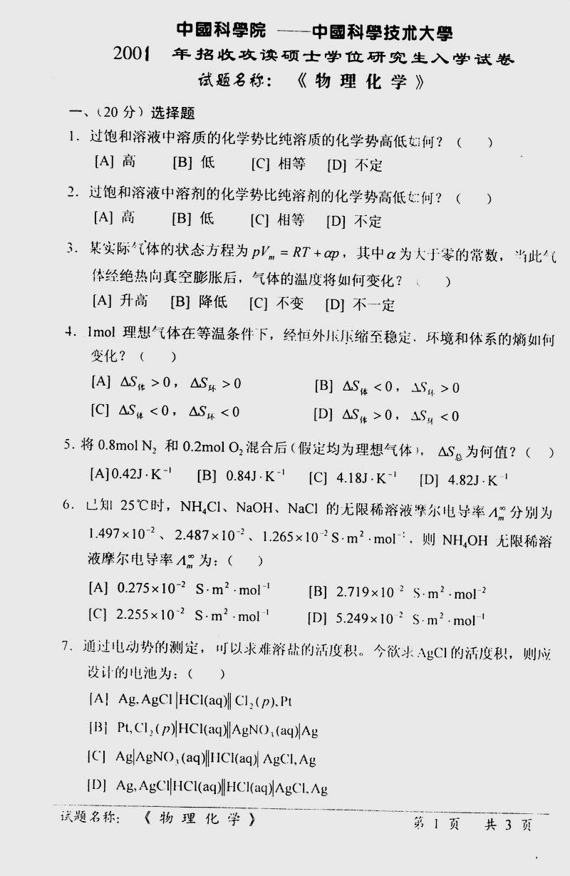 专业课考研经验 本站小编 FreeKaoyan 2018-01-22中国科学技术大学2000年考研真题-物理化学