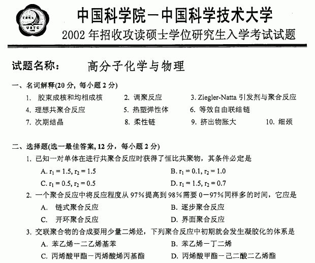 中国科学技术大学2002年考研真题-高分子化学与物理