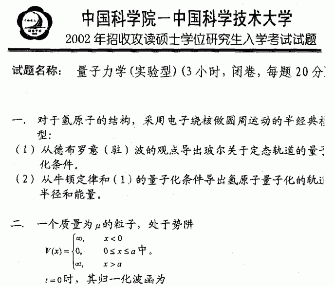 中国科学技术大学2002年考研真题-量子力学(实验型)