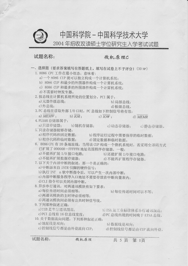 中国科学技术大学2004年考研真题-微机原理