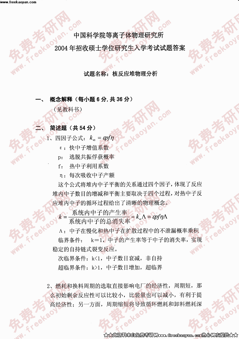 中国科学技术大学2004年考研真题-反应堆物理答案