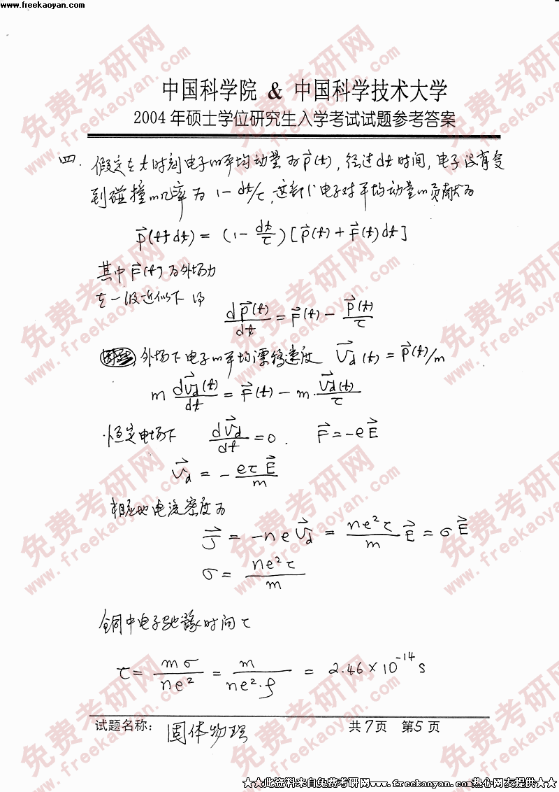 专业课考研经验 本站小编 FreeKaoyan 2018-01-22中国科学技术大学2004年考研真题-普通物理B答案