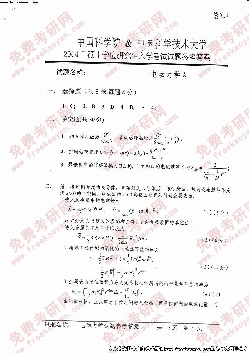 相关话题/考研真题 电动力学 中国科学技术大学 答案