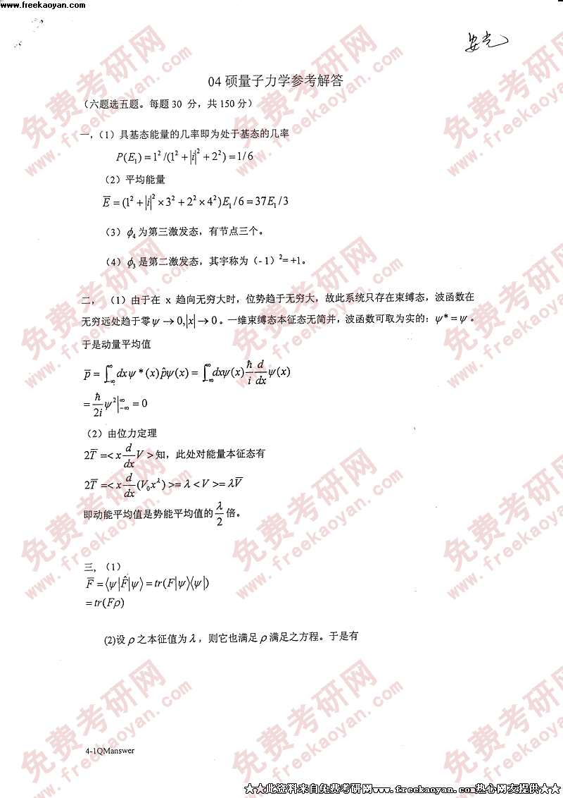 相关话题/考研真题 量子力学 中国科学技术大学 答案