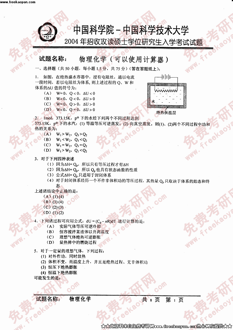 中国科学技术大学2004年考研真题-物理化学