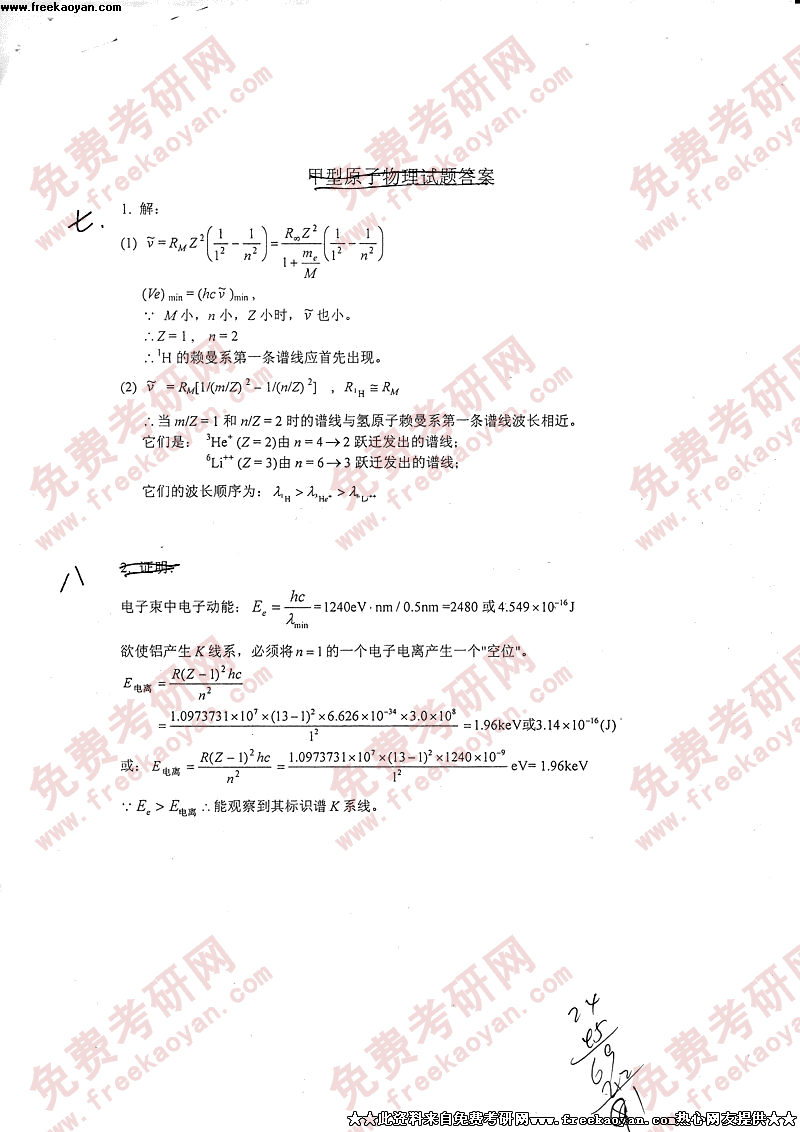 专业课考研经验 本站小编 FreeKaoyan 2018-01-22中国科学技术大学2004年考研真题-原子物理答案