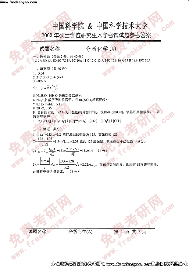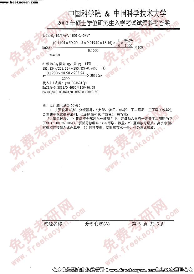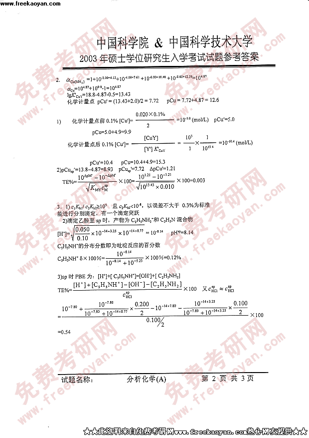 中国科学技术大学2003年考研真题-分析化学答案
