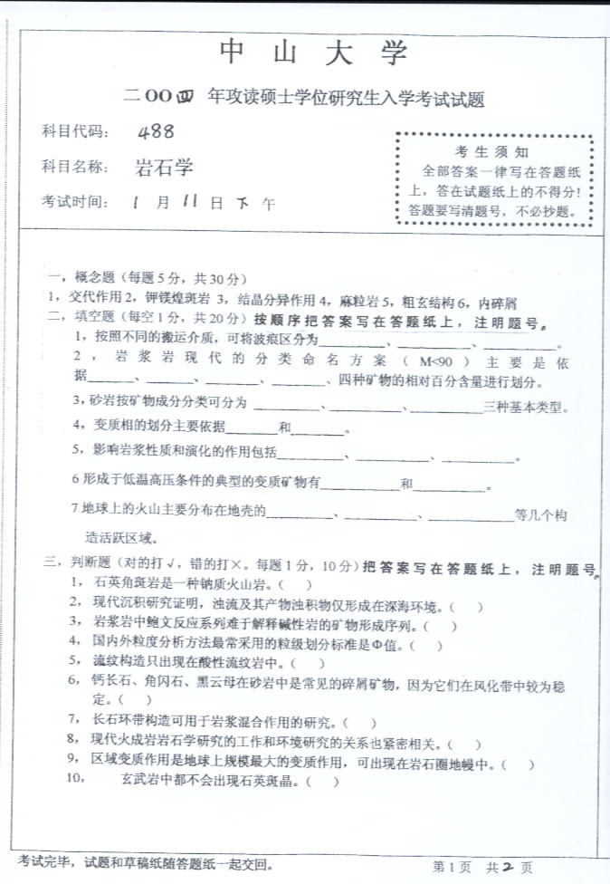 中山大学2004年考研真题-岩石学