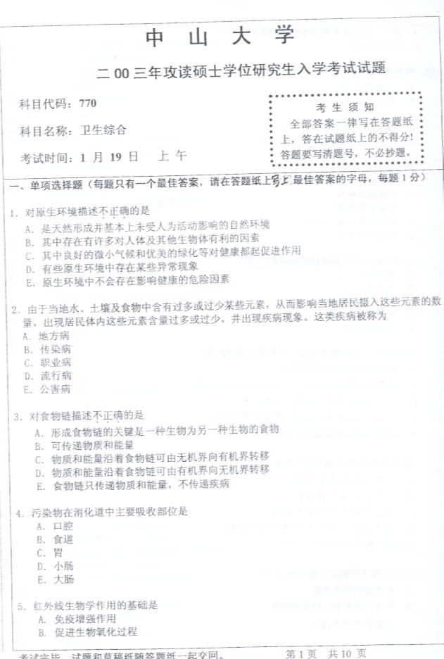 中山大学2001年攻读硕士学位研究生入学考试试题考试科目:地理学概论专业:自然地理学、人文地理学、地图学与地理信息系统一、 名词解释(每题3分)1. 流域2. 河漫滩3. 地震4. 自然规划5. 生物群落6. 维达尔7. 文化景观8. 地理学9. 聚落10. 形式文化区二、 选择题(每题3分)1.地 ...
